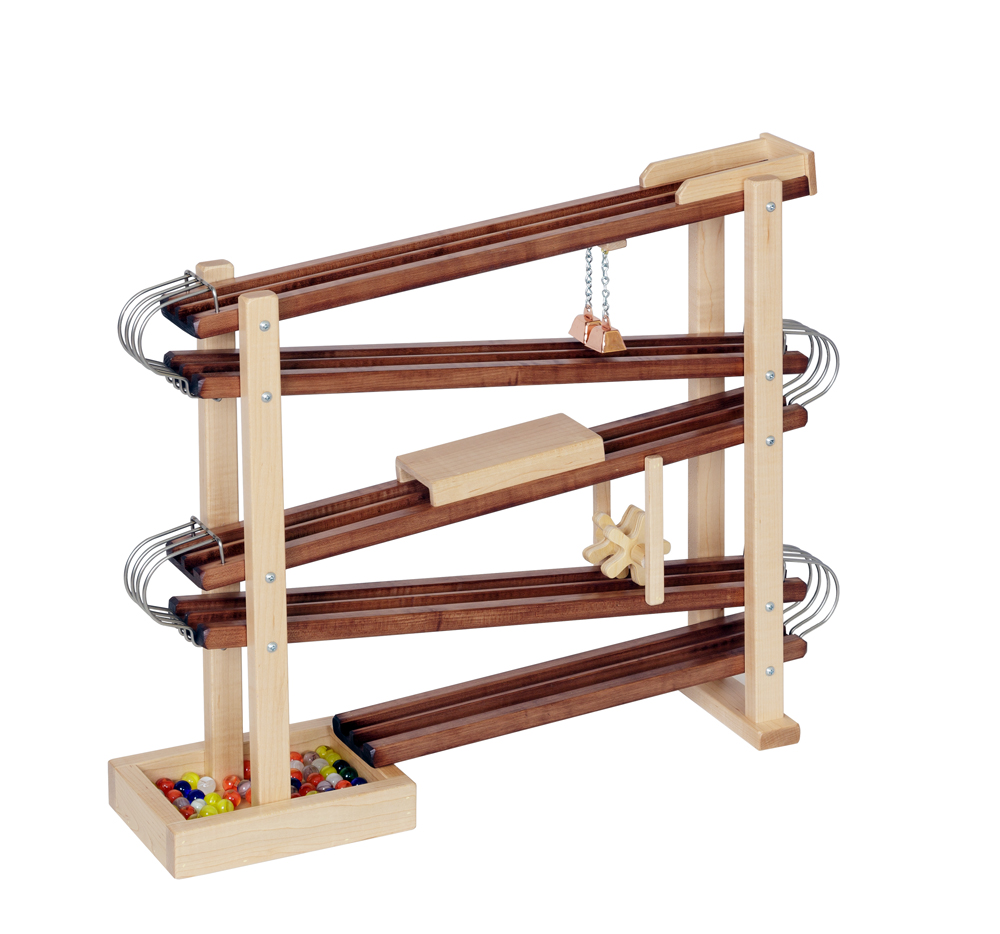 Marbles ring the bells, travel through the tunnel, and spin the wheels on their race to the bottom! Kiddos will delight with each exciting engagement.
