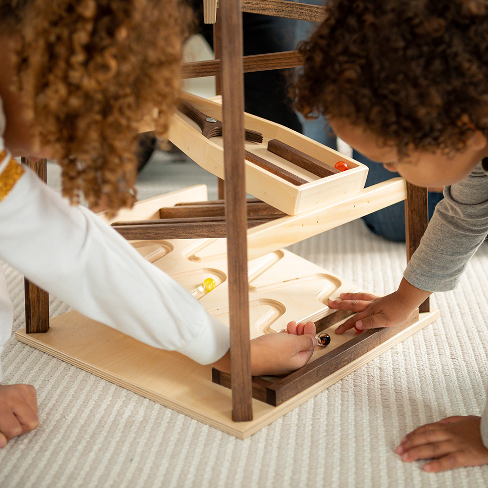 At just over 3-feet tall, our wooden marble pyramid is an obstacle course of fun and excitement! Marbles race down stairs, whirl, zag, and activate an array of surprises and simple machines. It’s a full sensory experience that kiddos will want to play again and again.