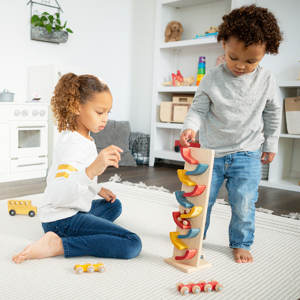 Our wooden car roller is a vertical racetrack that will engage and excite children of all ages. Load the wooden cars at the top and watch them jump from each platform as they wobble down the track.